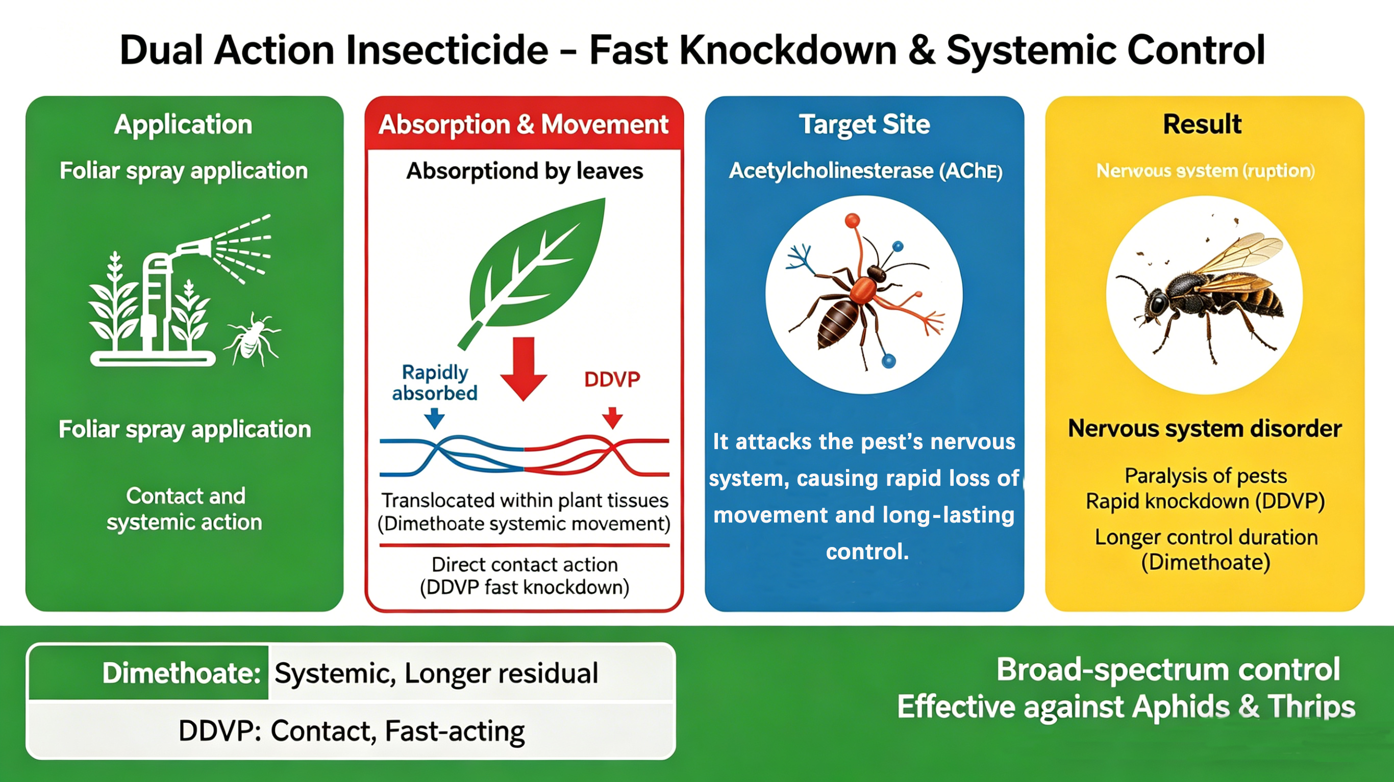 Effective broad-spectrum insecticide combining Dimethoate and DDVP, designed to control aphids, thrips, whiteflies, and other key crop pests with fast action and reliable results.
