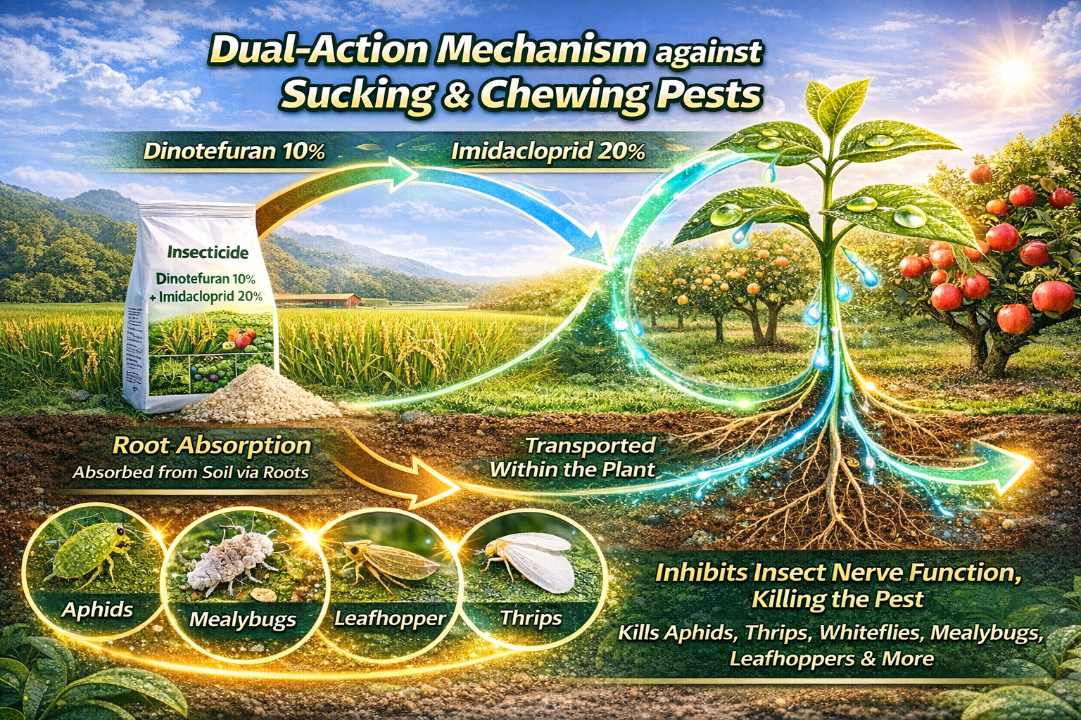 Dinotefuran 10% + Imidacloprid 20% WP – Fast & Long-Lasting Control of Sap-Sucking Pests on Rice, Vegetables, Fruit Trees, Cotton & Tea.